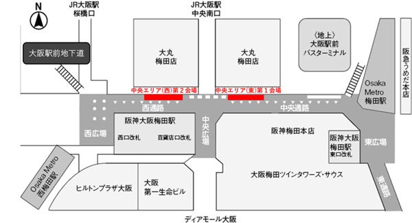 大阪駅前地下道 中央エリア(東・西) 壁面およびイベントスペース(※下図赤枠)