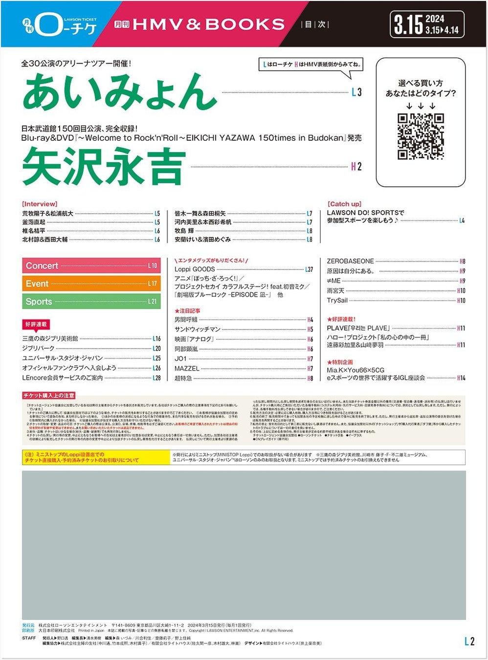 株式会社ローソンエンタテインメント(本社:東京都品川区、代表取締役社長:野口 透)が運営する「ローソンチケット」および「HMV&BOOKS」は、フリーペーパー『月刊ローチケ/月刊HMV&BOOKS』2024.03.15号を、3月15日(金)より、全国のローソンやHMVなどの店頭にて順次配布いたします。