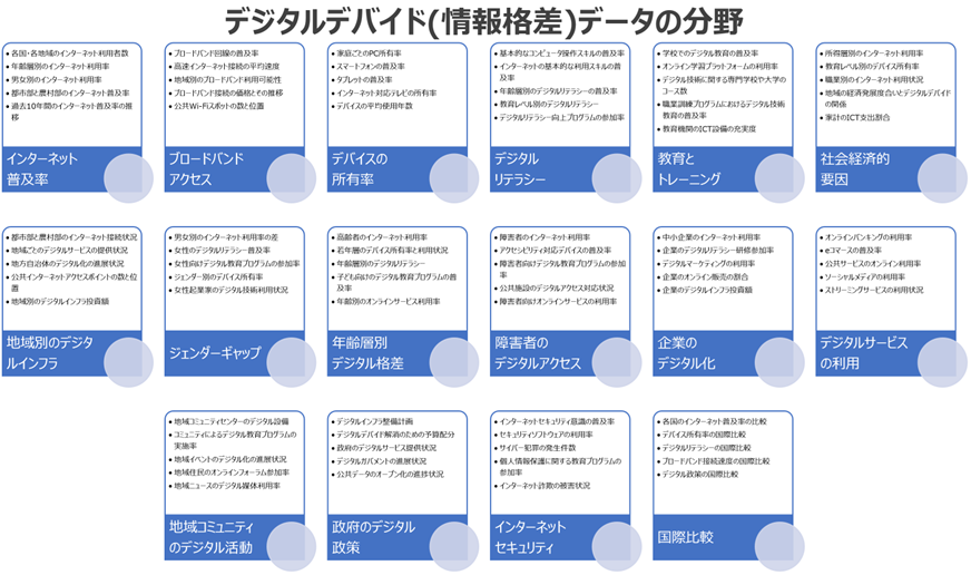 これらのデータは、デジタルデバイドの現状を把握し、その解消に向けた対策を立案するための貴重な基盤を提供します。