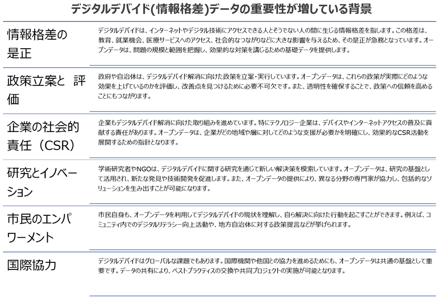 これらの背景により、デジタルデバイド分野のオープンデータは、社会全体の持続可能な発展を目指す上で欠かせない要素となっています。