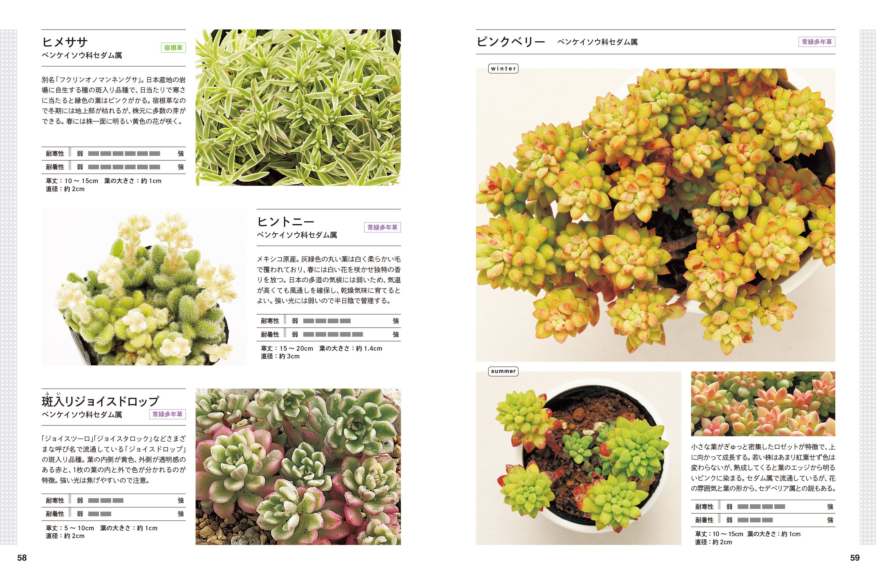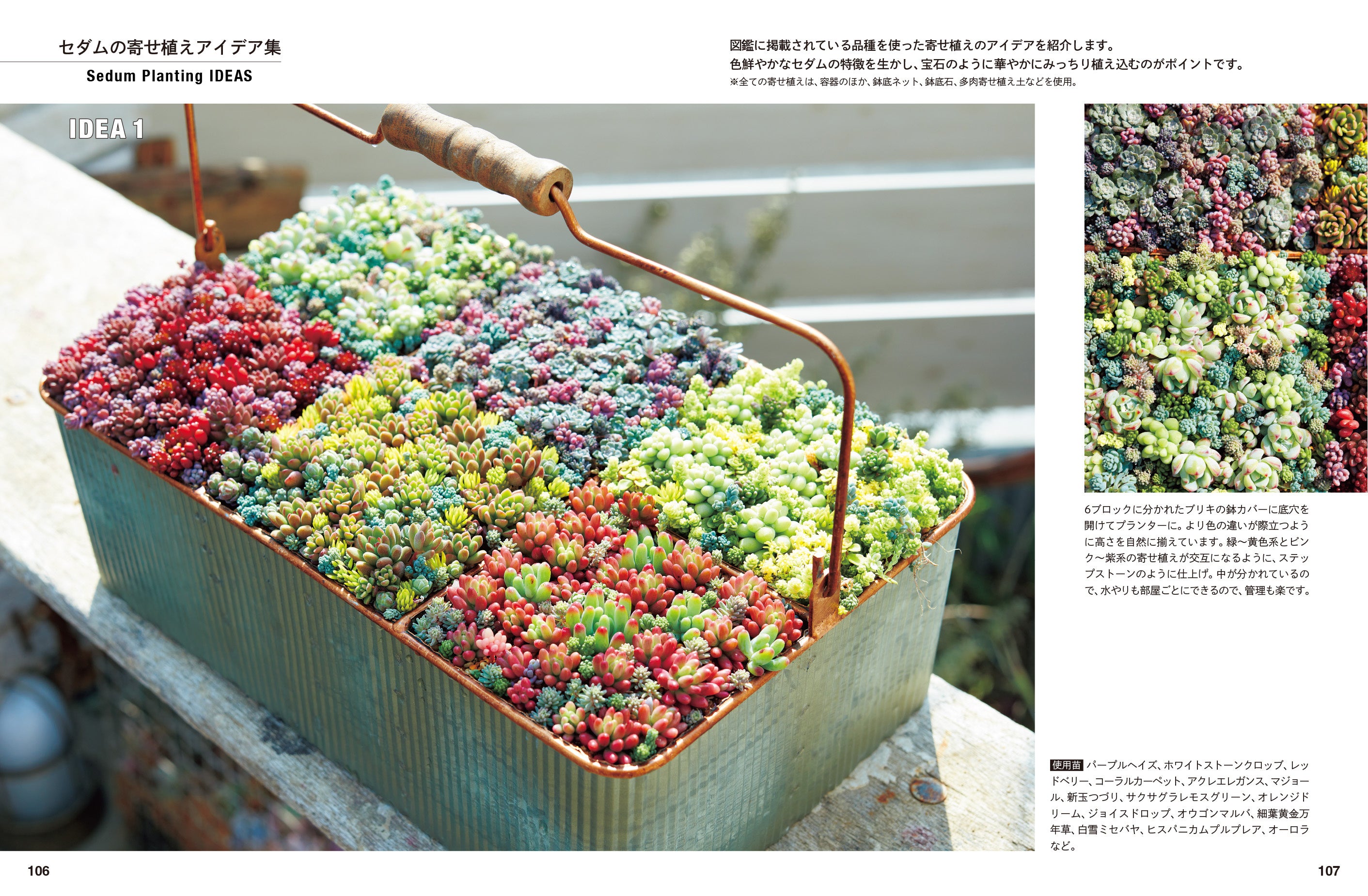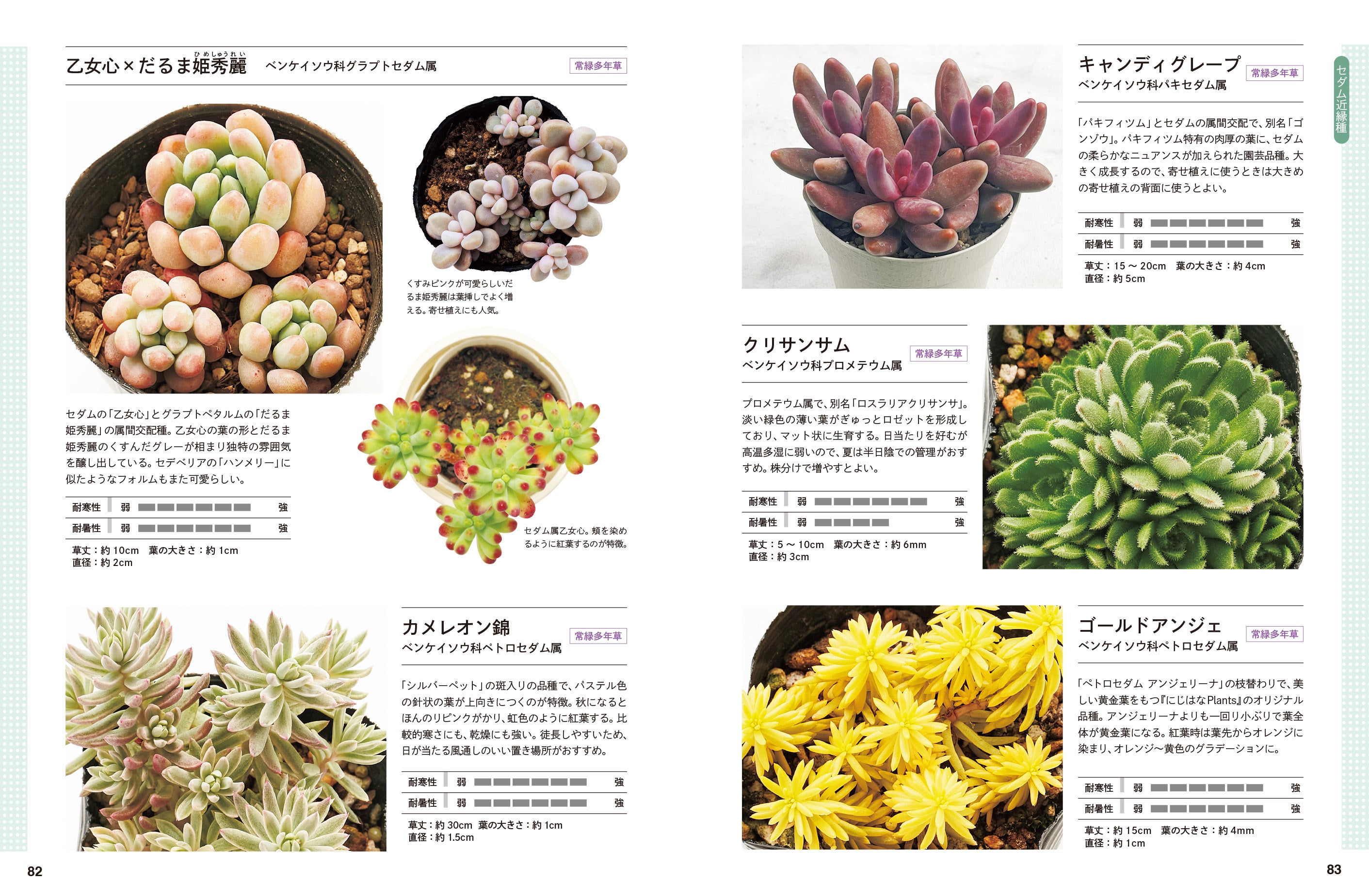 現在、セダムの分類学的な研究が進み、セダムとして流通していたものが他の属になるなど、再編成されています。本書では、国内で流通しているセダムやその近縁種を分類し、160種を収録。その特徴や育て方の基礎からコツまでをまとめました。掲載されている品種を使った寄植えのアイデアも紹介します。