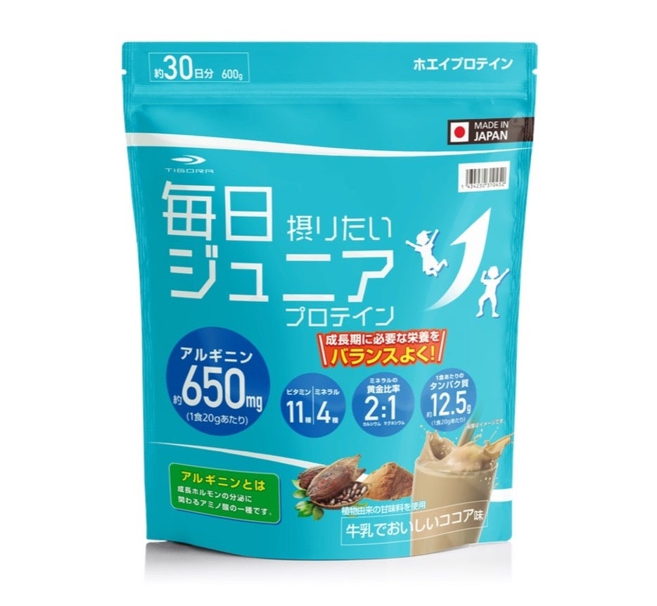 成長期のお子様に不足しがちな栄養素とタンパク質をバランス良く補えるプロテインです。成長ホルモン分泌に影響するアミノ酸アルギニンを650mg配合し、お子様の成長をサポートします。さらに、お子様でも飲みやすく、牛乳で割ることでより美味しく飲んでいただけるココア味で、日常に取り入れやすいよう開発しました。
