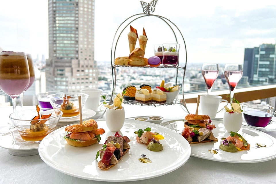 フレンチシェフが手掛けたセイボリー※1は、絵画のように美しく盛り付けたプレートでお届けいたします。スイーツは、季節の野菜やフルーツを使ったプチフールやグラスデザートを2段のティースタンドに端正に盛りつけました。ベルビューシートからの眺望に溶け込むティースタンドと、繊細で美しいセイボリーやスイーツを被写体に、食べることを忘れるくらいフォトタイムに時間を費やしてしまうかもしれません。