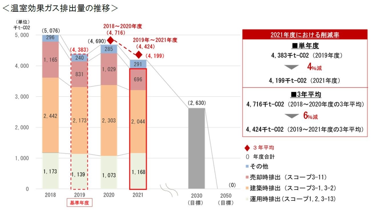 当社グループの温室効果ガス排出量は、各年度の竣工・売却物件のラインナップにより大きく変動するため、3年間の平均排出量を単年度の結果と合わせて開示しています。