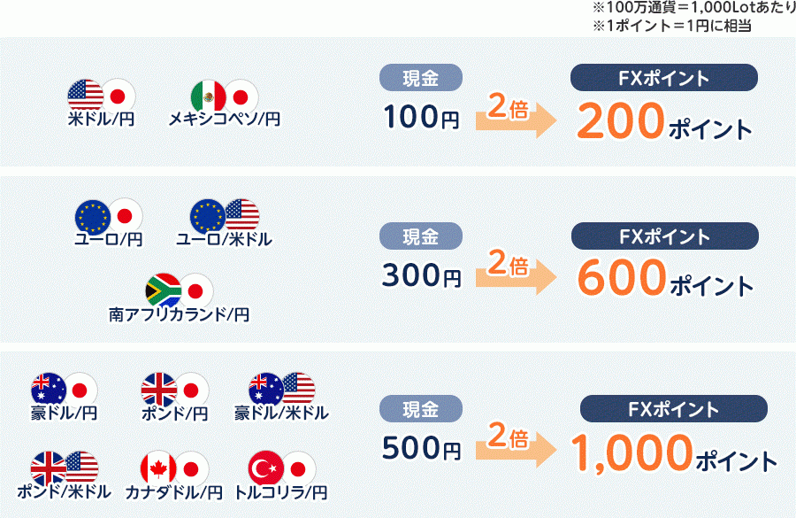 対象期間中の『外貨ネクストネオ』における指定通貨ペアの新規注文の取引量に応じて、最大200万円相当のFXポイント、