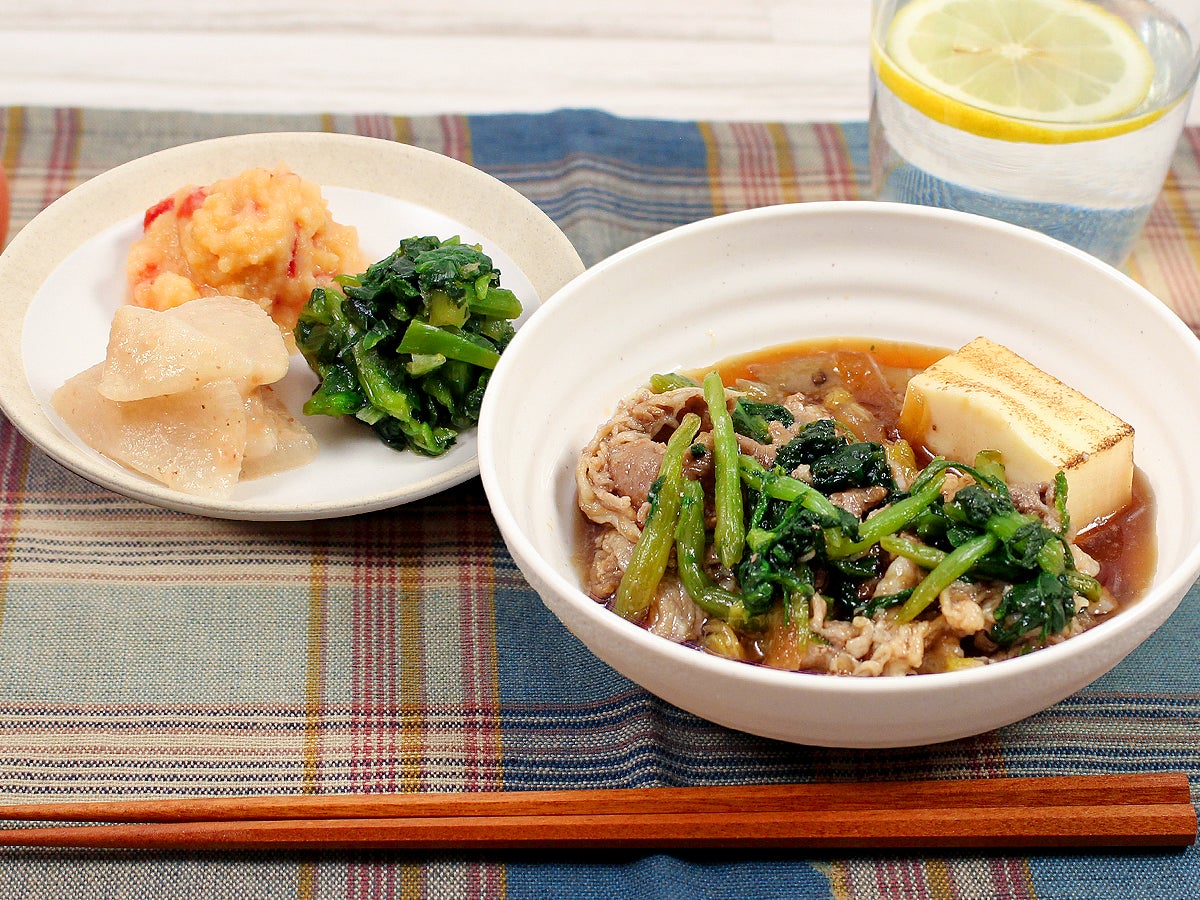 副菜は、かぶとツナの梅あえ、赤ピーマンポテト、菜の花のおろし醤油です。