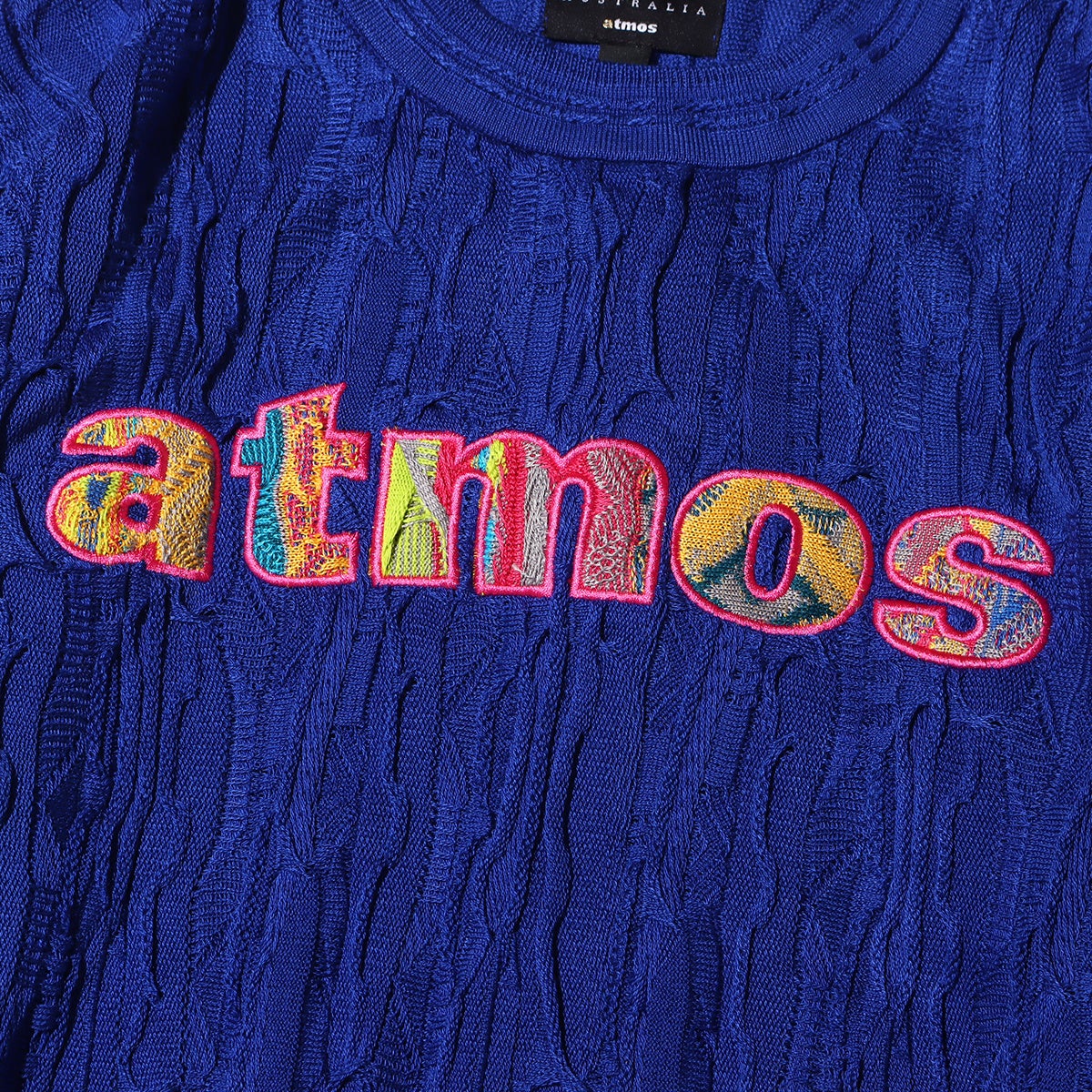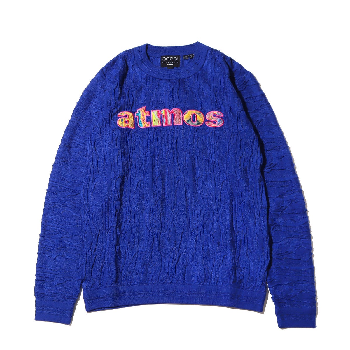 また、BLUEは「atmos」を象徴するカラーとなっており、マルチカラーとは対照的に全体をBLUEにまとめ、胸元の「atmos」ロゴがマルチカラーで入り「COOGI」らしさを演出します。
