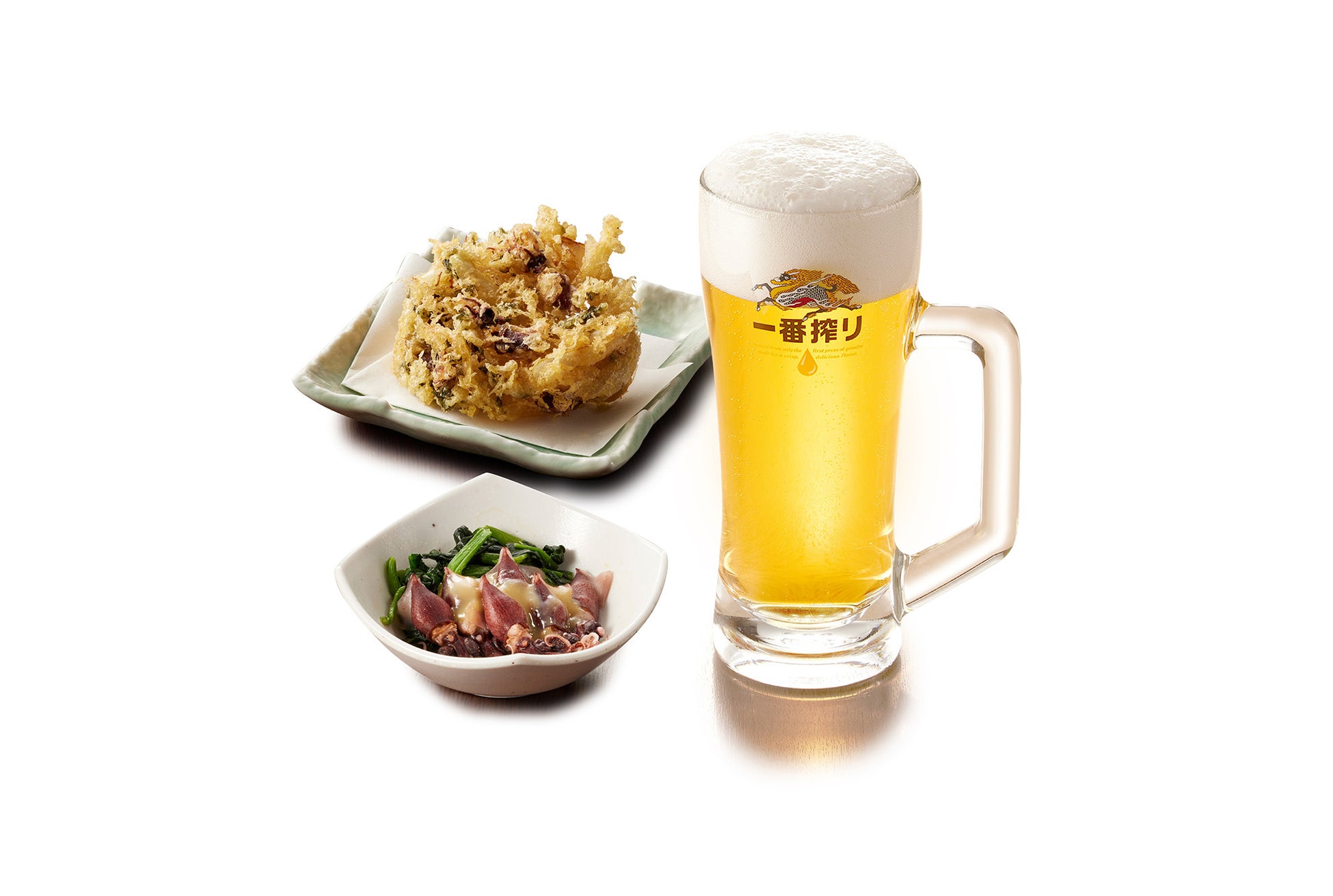 内容:あおさとほたるいかとたまねぎのかき揚げ、ほたるいかの辛酢味噌がけ、生ビール(中)