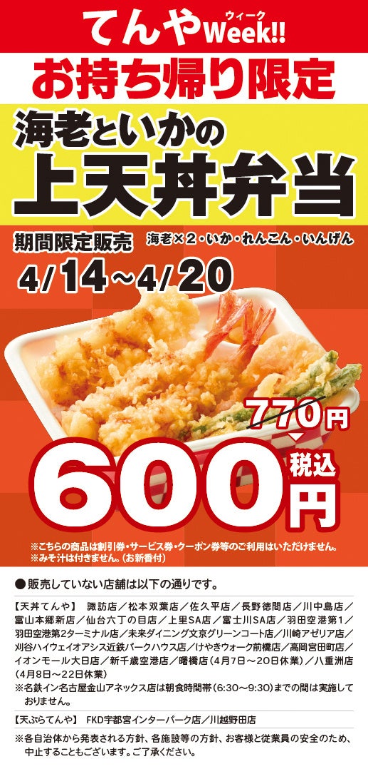 お持ち帰り限定「海老といかの上天丼弁当」 770円(税込)→600円(税込)に