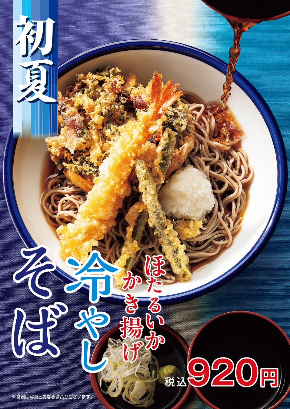 天丼てんやから天ぷらをのっけた冷やしそばがシリーズで登場。第1弾は、藪そばに初夏を感じる富山県産「ほたるいか」と「あおさ」、「たまねぎ」を合わせたかき揚げ、定番の「海老」「いんげん」の天ぷらをのっけ、大根おろし、生姜おろしをトッピング。そばつゆを上から回しかけてお召し上がりください。