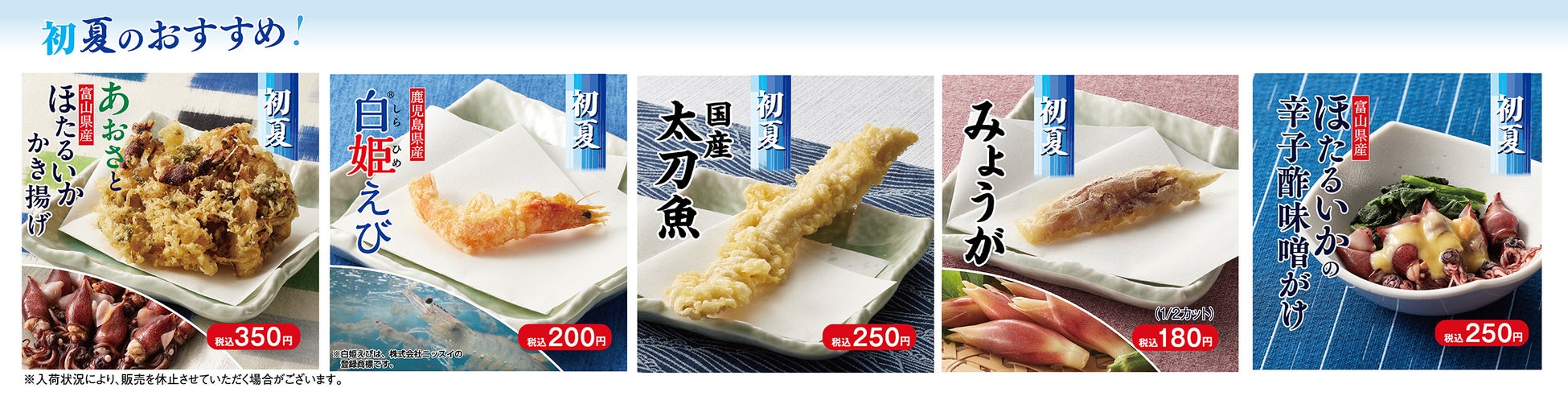 「あおさとほたるいかかき揚げ」や「太刀魚」などの初夏を感じられる食材が勢揃い。おひとつからどうぞ