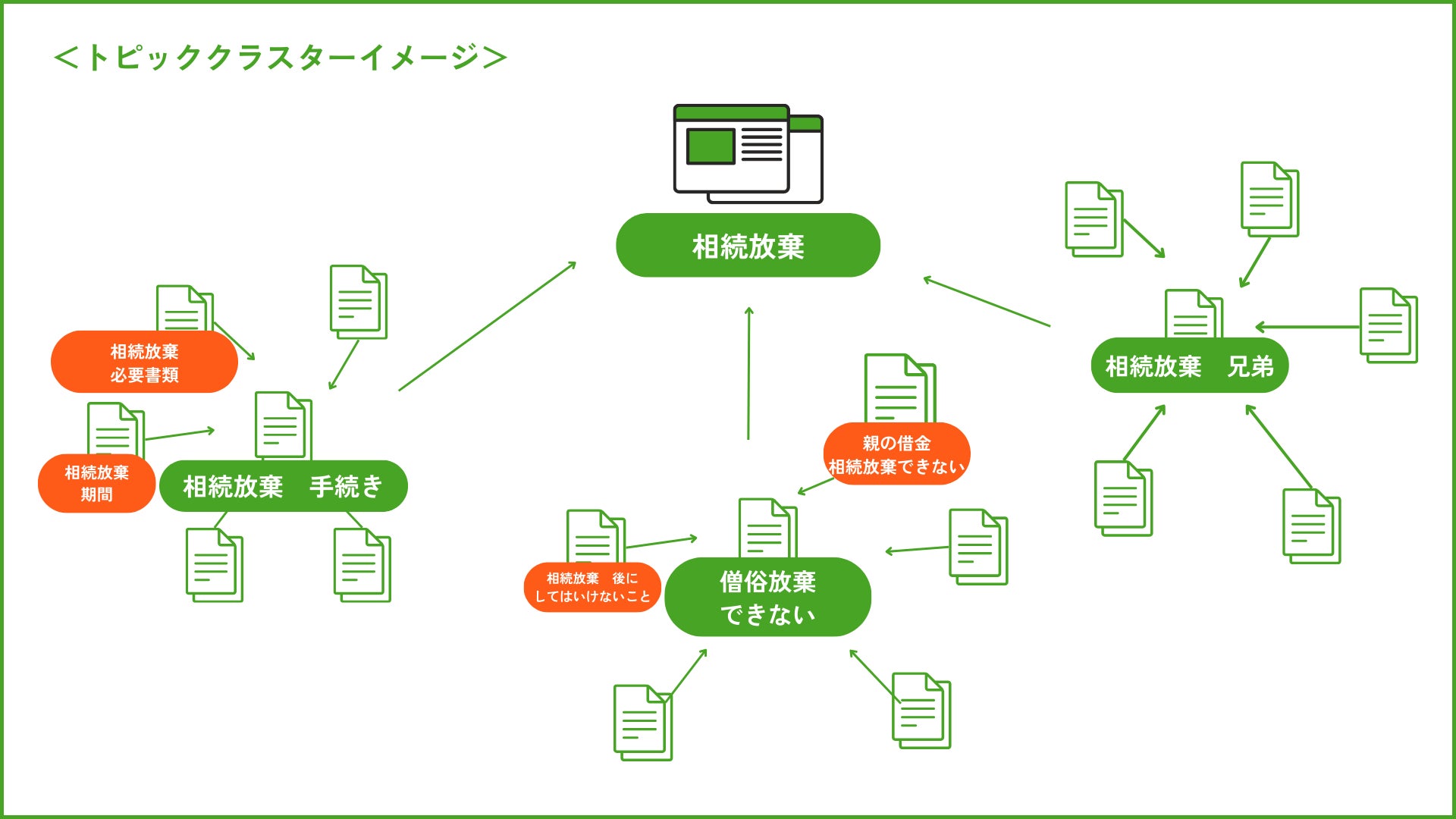 1つの中心記事(ピラーコンテンツ)と関連する複数のサブ記事を内部リンクでつなぐSEO手法。