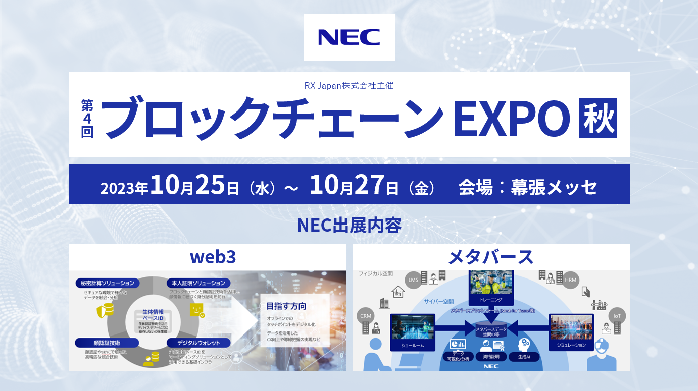 NECは、10月25日~10月27日に幕張メッセ(千葉市美浜区)で開催される、RX Japan株式会社主催「第4回 ブロックチェーンEXPO【秋】(以下、ブロックチェーンEXPO)」に出展します。