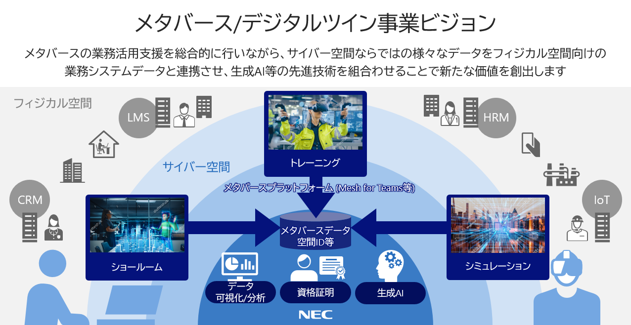 NECは2015年よりVRの業務活用を様々なお客様に提供する中でノウハウを蓄積しており、現在は仮想空間内で新たに取得できるデータに着目しながら社内でメタバース活用を試行しています。