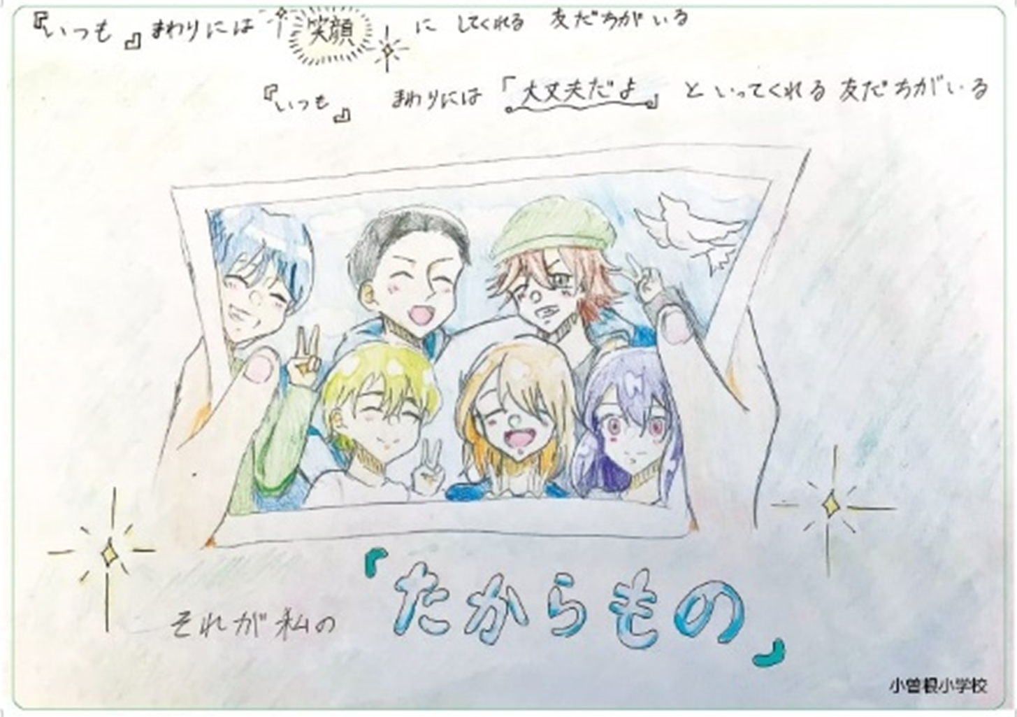 目的・想い:「日々大切にしたい想い」と「いじめをおこさないために」をテーマに6年生51人がそれぞれのイラストと言葉を考えました。楽しい時間は一緒に笑顔になって、つらい時は一緒に支え合ってくれる友達や仲間がいつもそばにいることを、児童全体に伝えたい。その想いから、低学年用・高学年用の2種類の下敷きを作りました。スローガンは「友だちは宝物」「そばには仲間がいるよ」です。
