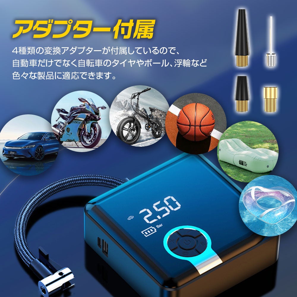 各種アダプター付属でボールや自転車のタイヤなど、車タイヤ以外にも使用できます。
