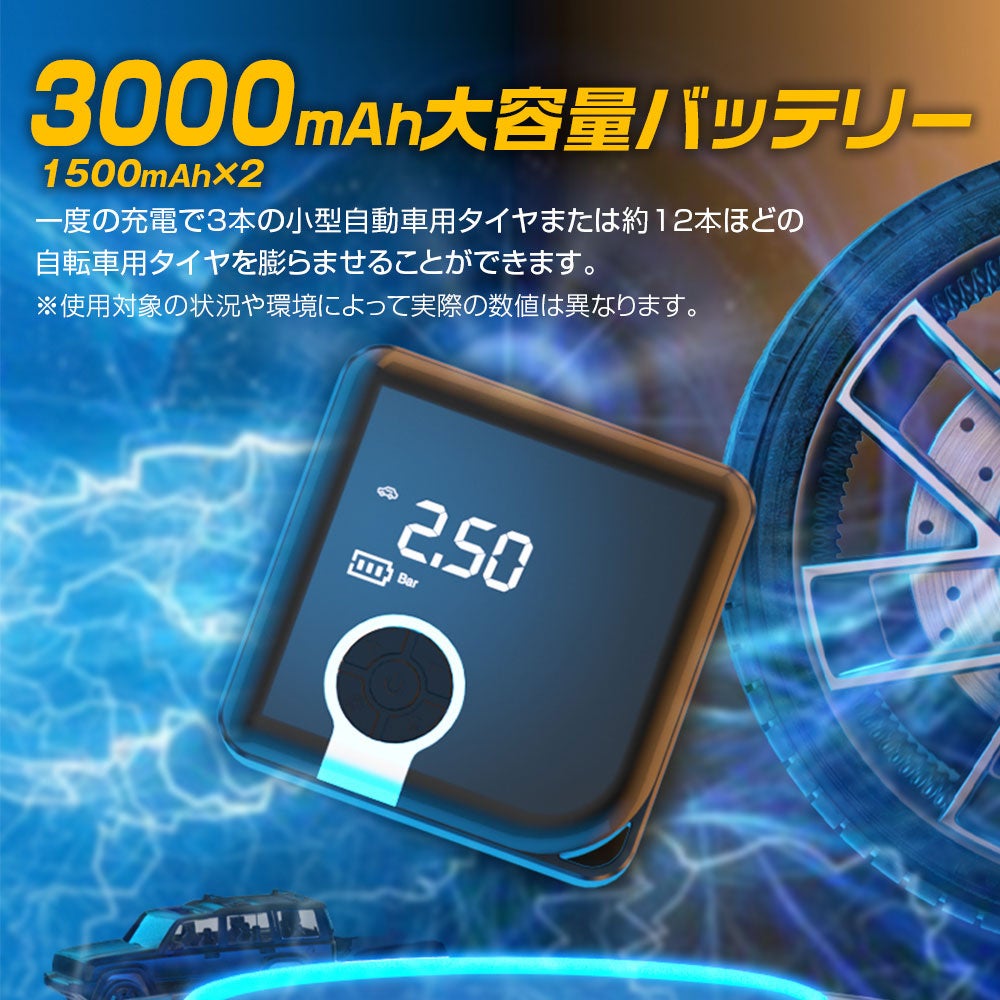 3000mAh大容量バッテリーで、一度の充電で自動車用タイヤに充填できます