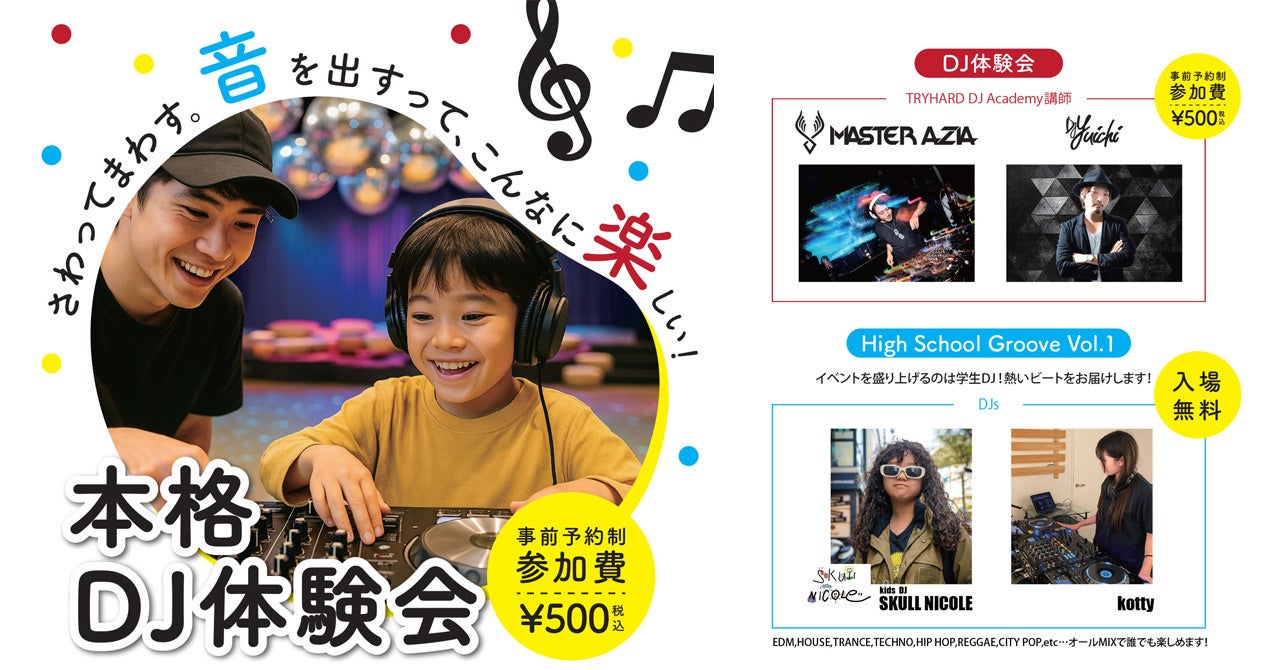 音楽を『聴く』だけじゃない、『操る』楽しさを体感しよう!大阪府岸和田市の複合施設WHATAWONにて、DJ体験イベントを4月26日(土)に開催します。講師には、国内最大級のDJアカデミー「TryHard DJ ACADEMY」からプロの指導陣が登場。さらに、人気のキッズDJ「SKULL NICOLE」も出演し、会場を盛り上げます。プロ仕様の機材にふれて、誰でも気軽にDJ気分を楽しめるイベントです。