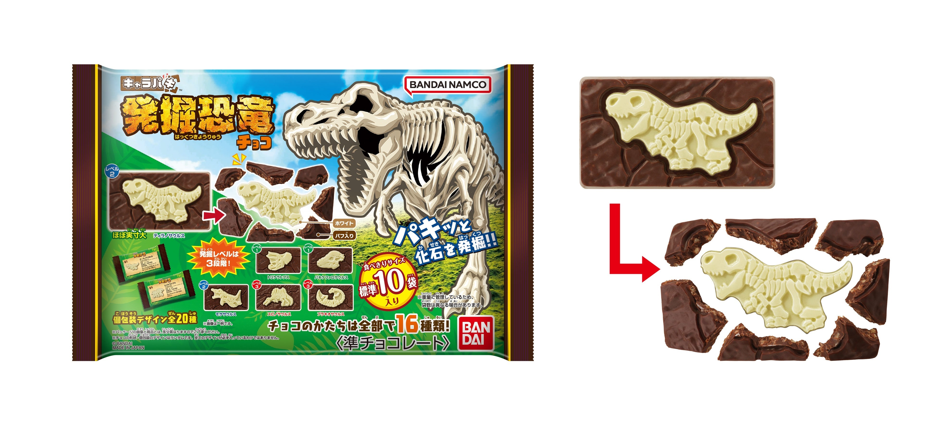 【不二家洋菓子店】バンダイの人気商品とコラボした、遊び心満載のスイーツ「キャラパキ 発掘恐竜チョコ」コラボ商品