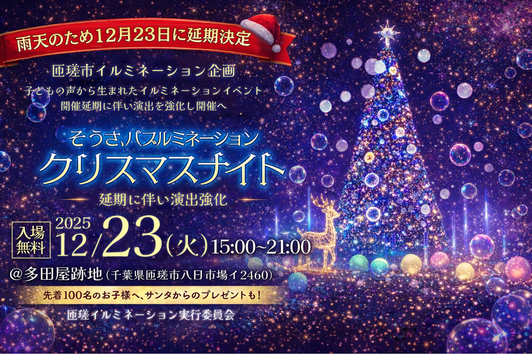株式会社ファーストイノベーション(本社:東京都中央区晴海3-13-1 DEUX TOURS EASTタワー52F、代表取締役社長:木ノ根雄志)ならびに、官民連携の地方創生団体 一般社団法人つながり応援(理事長:清水国明、副理事長:木ノ根雄志・梶川隆史)は、2025年12月21日(日)に開催を予定していた地域イルミネーションイベント「そうさ バブルミネーション クリスマスナイト」について、当日の天候不良が予想されることから、来場者の安全を最優先に考え、12月23日(火)へ延期することを決定しました。