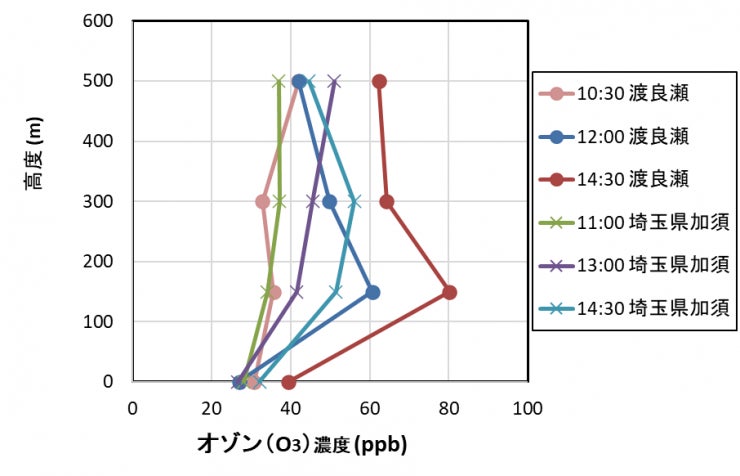 また、高度300mで、オゾンを生じる原因である揮発性有機化合物(VOC)を採取して成分を詳しく調べた結果、成分によって、高度の違いによる濃度差が異なることを把握しました。