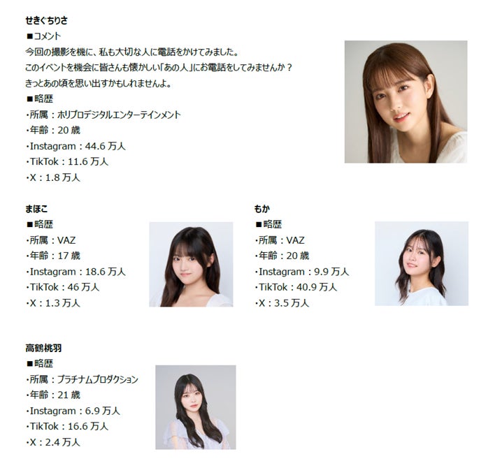 また、リンリリンクアンバサダーとして、「#ドコドリ 選抜メンバー」(※4)でInstagramのフォロワー数44.6万人のインフルエンサー、せきぐちりささんを起用します。本日ドコモ公式Youtube(※5)で公開されるリンリリンクの予告動画に出演するほか、当日会場にも登場します。なお、当日の会場にはせきぐちりささんにくわえ、「#ドコドリ 選抜メンバー」のまほこさん、もかさん、高鶴桃羽さんも登場予定(※6)です。
