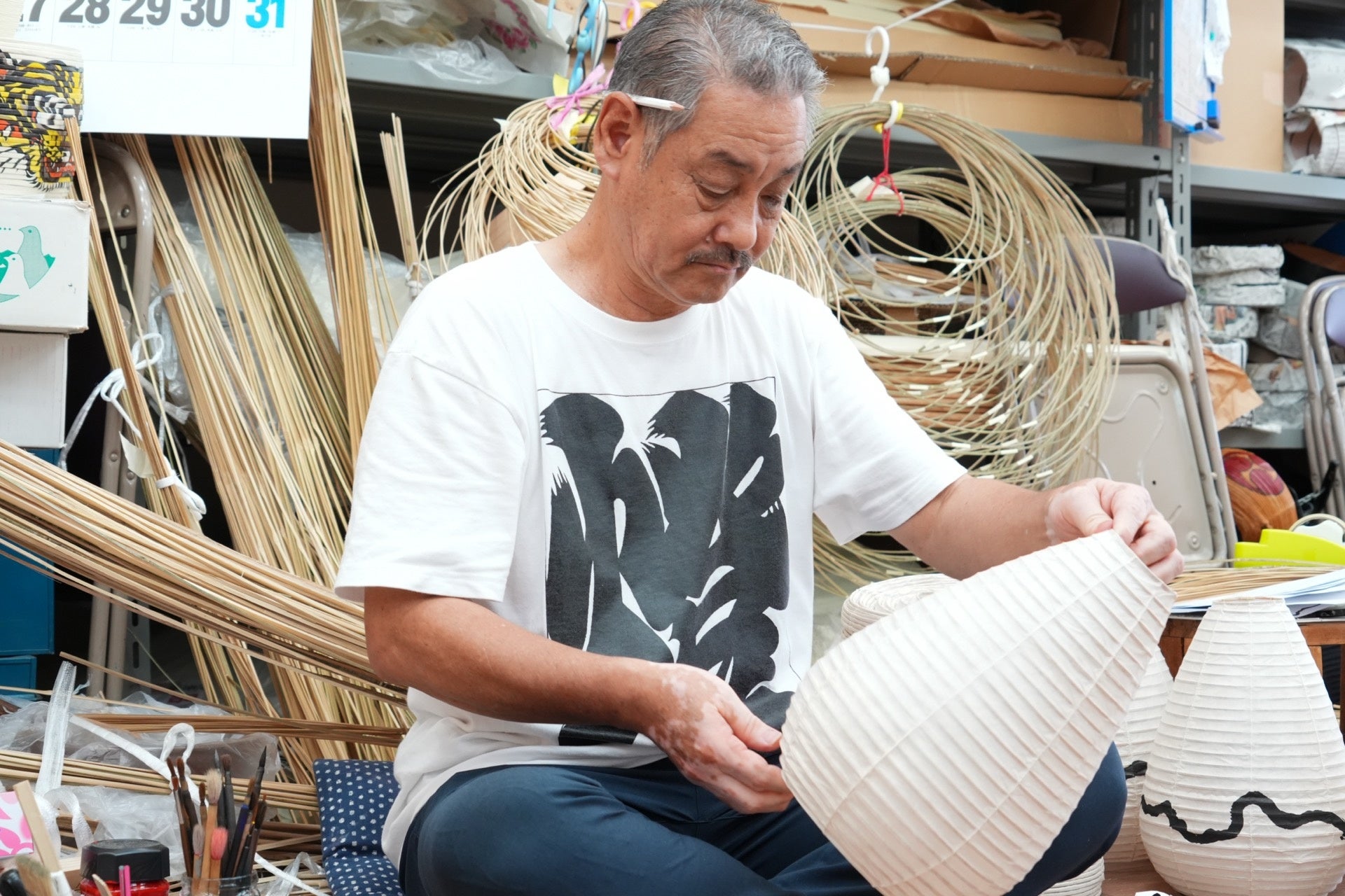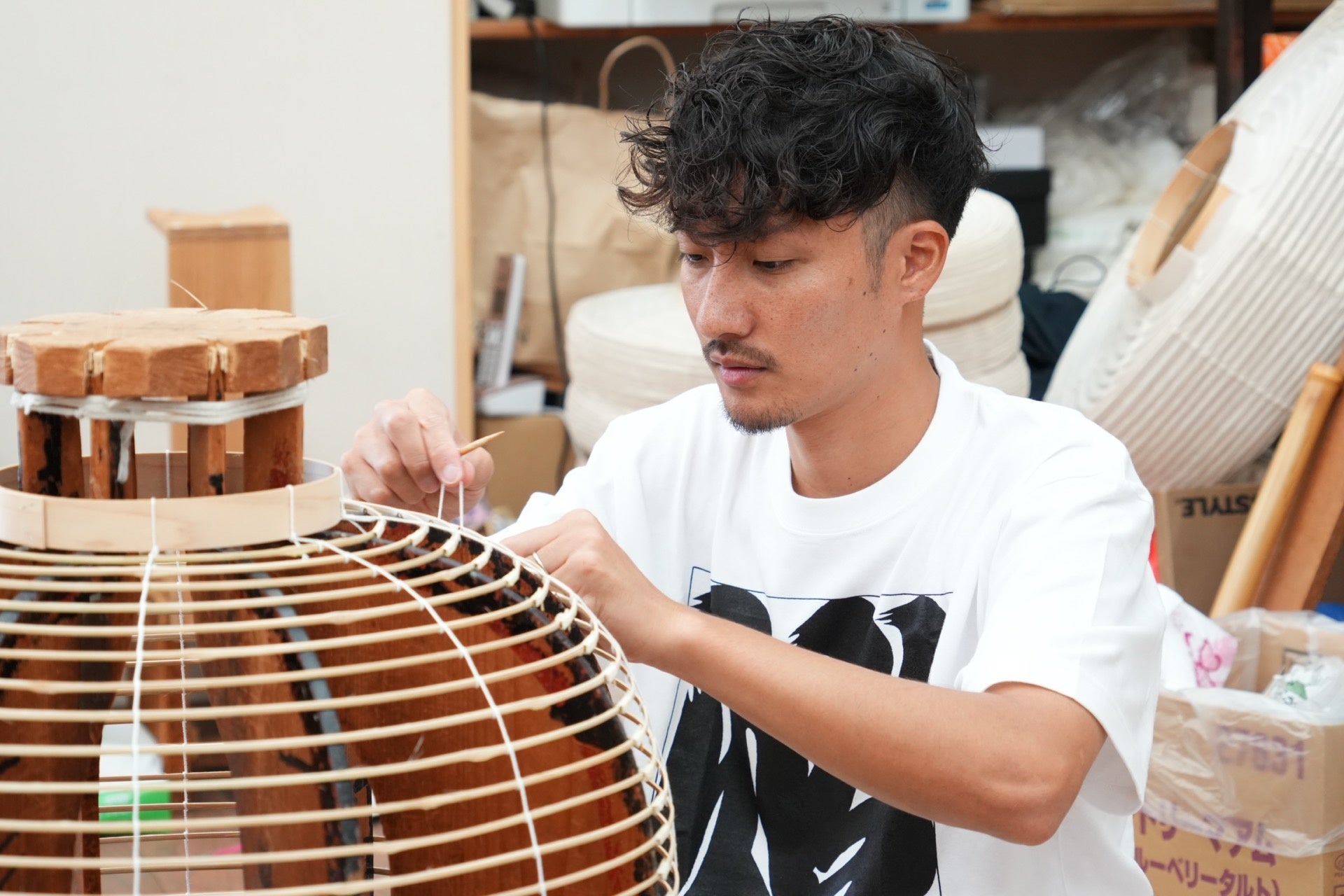 小嶋商店では、九代目の小嶋護さんと次男の諒さんが今も「地張り式」で提灯を作り続けている。工房で実際に提灯を作る作業を見せていただいた。竹で作った骨と骨を糸で繋いでいく「糸釣り」。提灯の強度を左右する重要な作業だ。諒さんは素早い作業で骨と骨を繋いでいく。