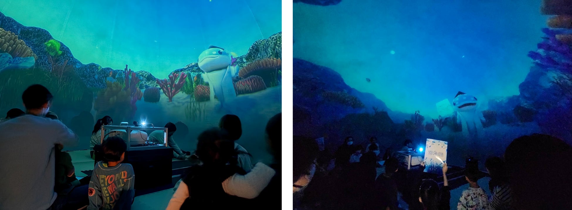 「海の大冒険!ブッチくんと学ぶ探検ツアー!」では、探検ツアーのナビゲーターとして、おしゃべりなジンベエザメのキャラクター「ブッチくん」が登場し、まるで本当に海に潜っているかのような臨場感あふれる映像の中、参加者を海の大冒険へと誘いました。ブッチくんの声は、吉本興業所属の俳優・グッド良平。さんと太田プロダクション所属の芸人・こいでまほさんが担当しました。ユーモアあふれるトークで参加者の子どもたちとリアルタイムな掛け合いを繰り広げ、会場を沸かせました。