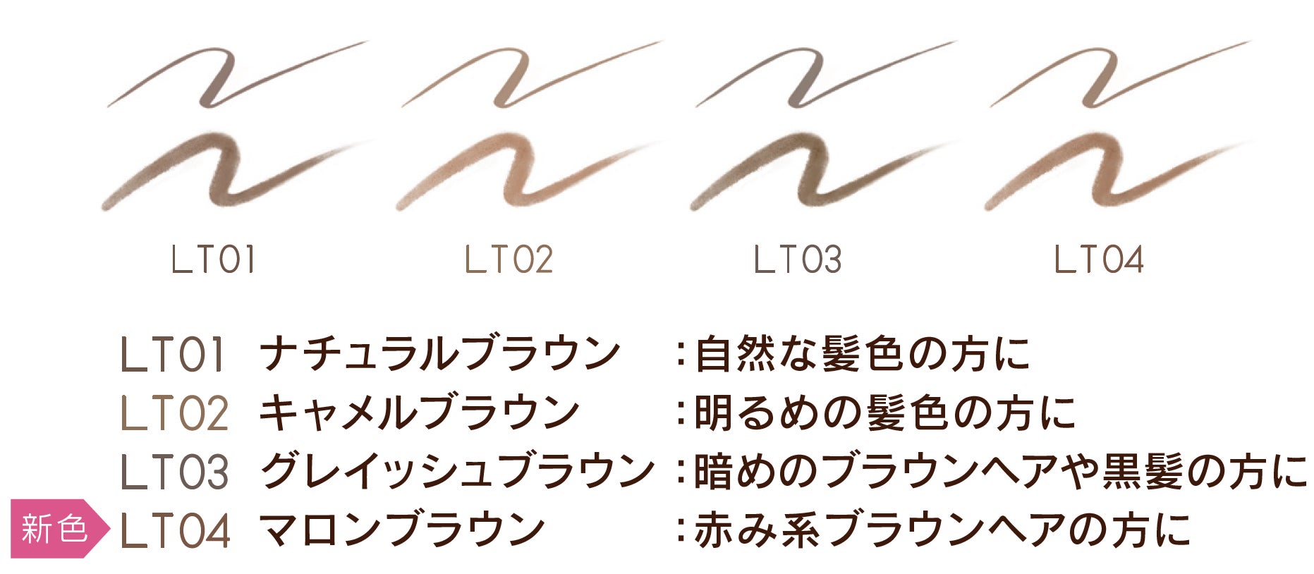 好評の「LT01(ナチュラルブラウン)」、「LT02(キャメルブラウン)」、「LT03(グレイッシュブラウン)」の色味はそのままに、看板商品「パウダー&ペンシル アイブロウEX」の人気色を踏襲したトレンドの赤みのあるブラウンカラー「LT04(マロンブラウン)」を追加。より髪色にあわせた色選びができるようになりました。