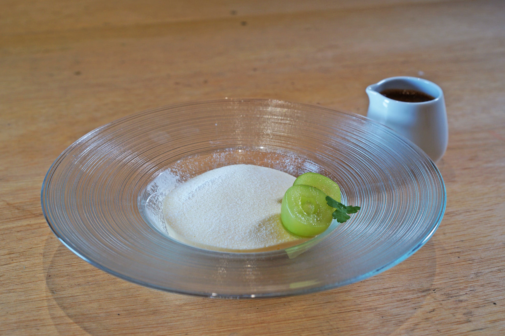 まるで新雪のように真っ白に仕上げました。添えられたエスプレッソをかけ、香りと味わいの変化をお楽しみください。マスカルポーネムースの中には、カカオニブや、生チョコ、サブレなどが織り込まれています。