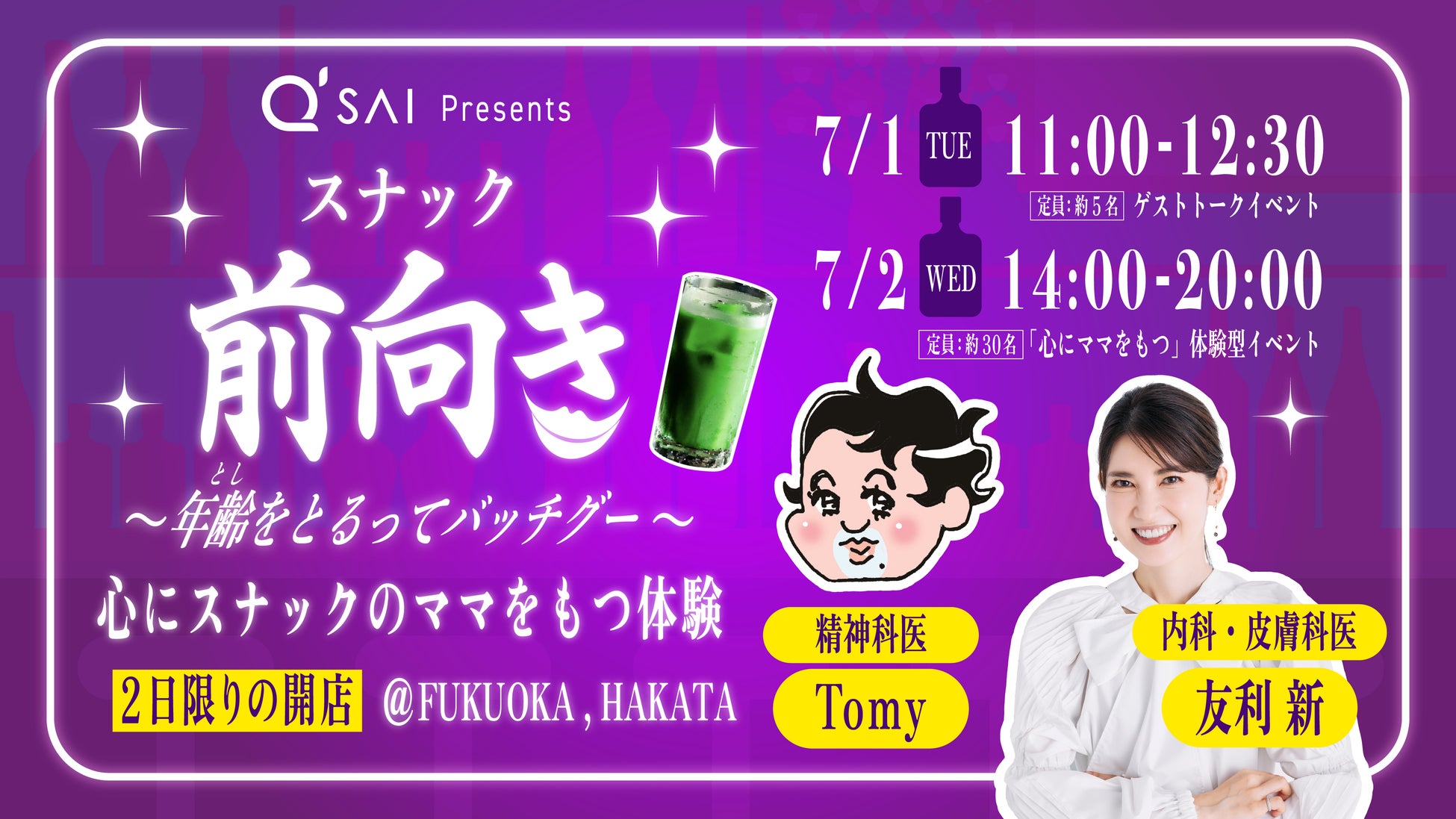 キューサイ株式会社(本社:福岡市中央区、代表取締役社長: 石川 順朗)は、2025年7月1日(火)・2日(水)の2日間、セルフエイジズム(自己の加齢に対するネガティブな思い込み)からの脱却を目指す体験型イベント「スナック前向き~年齢をとるってバッチグー~」を開催いたします。市区町村別スナック店舗数日本一(※1)を誇る福岡市博多区で実施される本イベントでは、「こころの日(7月1日)」にあわせて専門家によるトークセッションや、スナックのママとの対話体験を通じて、「心に【スナックのママ】をもつ」という新しい心のセルフケアの形を提案します。また、本企画へ賛同してくださった地元スナック4店舗と連携し、青汁の無料提供も行うことで、ココロとカラダの両面から自分らしく年齢を重ねる生き方をサポートします。