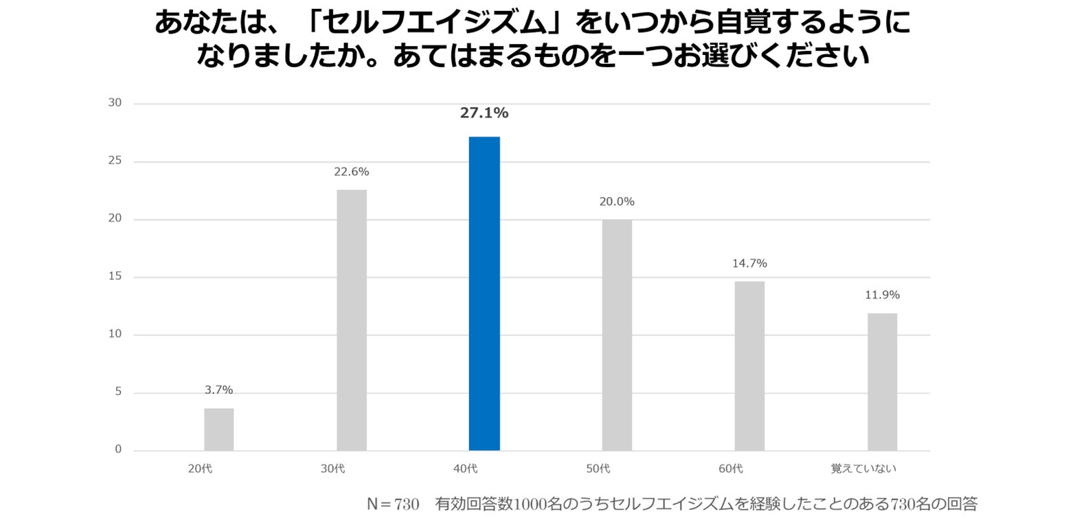 日本人の平均寿命は世界トップレベルにあり、人生100年時代が現実となる中、心身ともに前向きに年齢を重ねる「ウェルエイジング」への関心が高まっています。一方で、「もう若くない」「年齢的にふさわしくない」といった自己の加齢に対する無意識な思い込み“セルフエイジズム”が、自分らしく生きることの妨げとなる社会課題として顕在化しています。当社が実施した調査(※2)では、セルフエイジズムを自覚し始めた年齢として最も多かったのは40代でした。加齢による体の変化や不調を感じやすくなる時期と重なることで、「もう若くない」「無理がきかなくなった」といった意識が芽生えやすくなり、セルフエイジズムに陥りやすくなると考えられます。