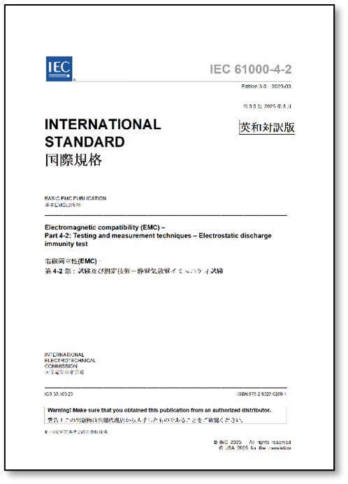 一般財団法人日本規格協会(本部:東京都港区、理事長:朝日弘)は、2025年7月1日(火)に「IEC 61000-4-2 Ed. 3.0:2025 (b) 電磁両立性(EMC)-第4-2部:試験及び測定技術-静電気放電イミュニティ試験」の邦訳(英・日対訳版)を発行いたしました。