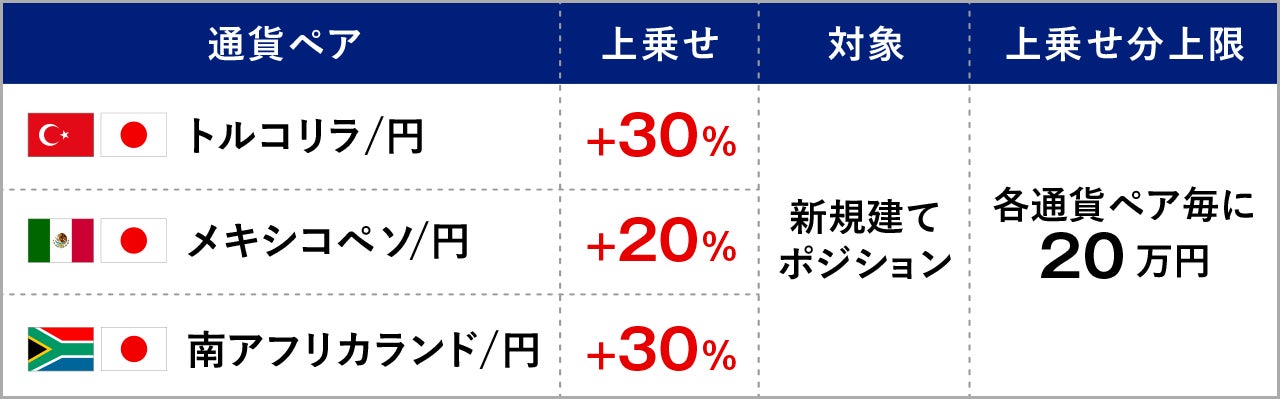 キャンペーン期間中に、トルコリラ/円(TRY/JPY)・メキシコペソ/円(MXN/JPY)・南アフリカランド/円(ZAR/JPY)において新規建てしたポジションを対象に、受取スワップポイントに上乗せして、下表の通りキャッシュバックいたします。増額率は、トルコリラ/円で30%、メキシコペソ/円で20%、南アフリカランド/円で30%となります。