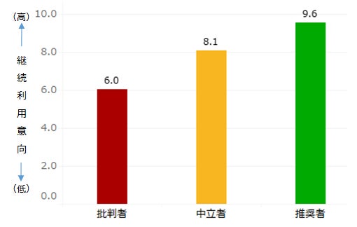 対象の銀行の利用者に対し、今後の継続利用意向を0~10の11段階でたずねたところ、「推奨者」(推奨度が「9」~「10」の回答者)は平均9.6ポイント、「中立者」(推奨度が「7」~「8」の回答者)は平均8.1ポイント、「批判者」(推奨度が「0」~「6」の回答者)は平均6.0ポイントとなり、推奨度が高いほど継続利用意向も高くなる結果となりました。