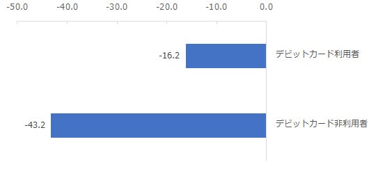 一方で、該当の銀行におけるデビットカードの利用有無別にNPSを分析したところ、デビットカード利用者のNPSは-16.2ポイントとなり、非利用者よりもNPSが高くなりました。