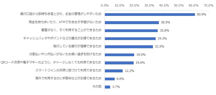 該当の銀行でデビットカードを利用している人に対し、デビットカードを利用する理由を調査したところ、「銀行口座から即時引き落とされ、お金の管理がしやすいため」(60.9%)が最も高く、次いで「現金を持ち歩いたり、ATMで引き出す手間がないため」(36.5%)、「審査がなく、すぐ利用することができるため」(35.8%)、「キャッシュバックやポイントなどの還元がお得であるため」(34.3%)といった理由が続きました。現状では日常の決済手段としてデビットカードの利用は低い現状ではあるものの、デビットカード利用者においては、口座管理のしやすさやATMで現金を引き出す必要がないといったメリットを感じており、ロイヤルティ醸成につながっているとみられます。