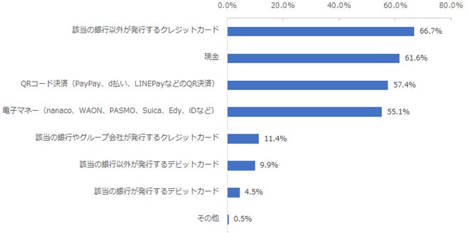 このことを背景に普段の買い物において利用している決済手段や方法を調査したところ、最も高くなったのは「該当の銀行以外が発行するクレジットカード」(66.7%)となり、次いで「現金」(61.6%)、「QRコード決済」(57.4%)と続き、「該当の銀行が発行するデビットカード」は4.5%にとどまりました。
