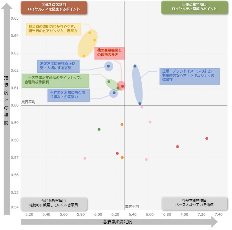 一方でロイヤルティ向上のために優先的に改善が期待される項目としては「担当者の説明のわかりやすさ」や、「自身の状況やニーズに対する担当者のヒアリング力」、「担当者からの自分に合った最適な商品・サービスの提案力」といった担当者の対応力に関連する項目となりました。このほか、「ニーズを満たす商品のラインナップ・商品の魅力」、「サービスの対価に見合った合理的な手数料」といった商品や手数料に関連した項目や、「お客様に寄り添う姿勢・大切にする姿勢」、「不祥事を未然に防ぐ取り組み・企業努力」といった企業姿勢に関する項目においても今後の改善が期待される結果となりました。