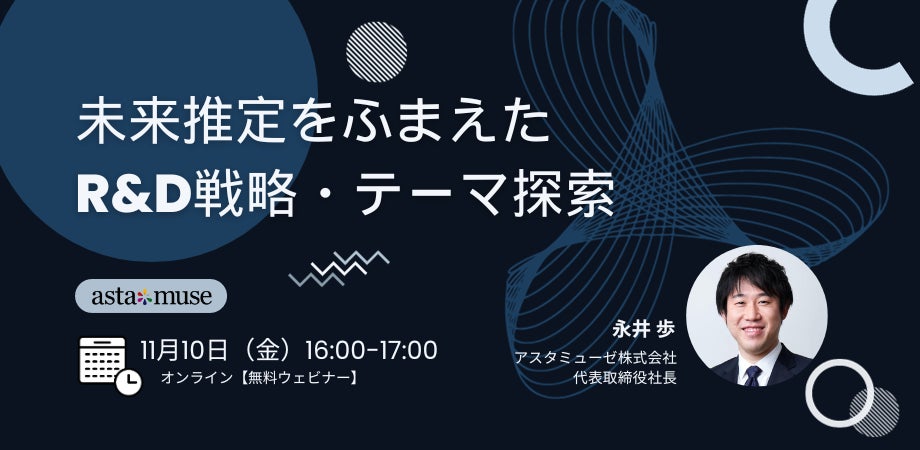 今回開催するウェビナー「未来推定をふまえたR&D戦略・テーマ探索」では、世界中の社会課題・無形資産・イノベーション情報を統合した世界最大級のデータベースを保有しているアスタミューゼが、未来を構成する要素の客観的且つ定量的な分析から、企業価値の最大化する効果的なR&D戦略の策定や事業のテーマ探索など、社内課題となりやすい点と解決に導くための考え方をお伝えいたします。