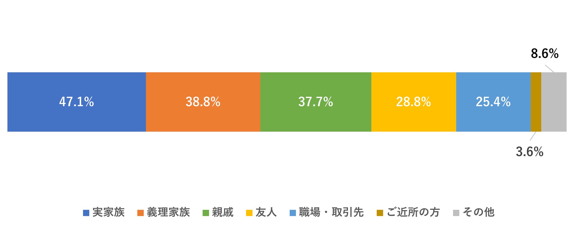 「お中元・夏のギフトはどなた宛に贈る予定ですか。」という質問に対して「実家族」(47.1%)、「義理家族」(38.8%)、「親戚」(37.7%)が上位だった。友人や職場・取引先へ贈るより、家族や親族などのプライベートな相手に贈る人が多い傾向がみえてきた。