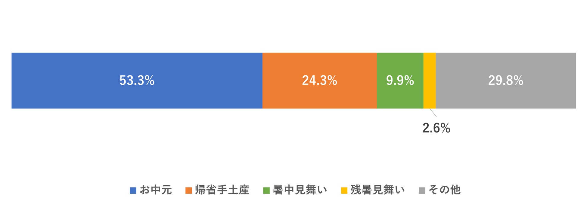 「今年の夏にギフトを贈る予定があるものをお選びください。」という質問に対して、半数以上が「お中元」(53.3%)を贈ると回答。以下、「帰省手土産」(24.3%)、「暑中見舞い」(9.9%)、「残暑見舞い」(2.6%)、「贈る予定はない」と回答した人は約3割(29.8%)だった。お中元や暑中見舞いに限らず、帰省手土産も、夏の季節のご挨拶のひとつとして考える人が多いようだ。