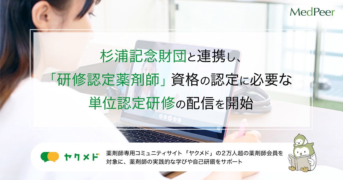 メドピア株式会社(東京都中央区、代表取締役社長 CEO:石見 陽、以下当社)は、公益財団法人杉浦記念財団(愛知県大府市、理事長:杉浦 昭子、以下杉浦記念財団)と連携し、「研修認定薬剤師」資格の認定研修事業を開始いたします。本認定研修事業では、当社が運営する、薬剤師会員数2万人超の薬剤師専用コミュニティサイト「ヤクメド」内で、必要な単位が取得できるライブ研修を配信いたします。当社は、本事業を通じて、最新の薬学や技術を効率的に習得できる場を「ヤクメド」会員に提供してまいります。