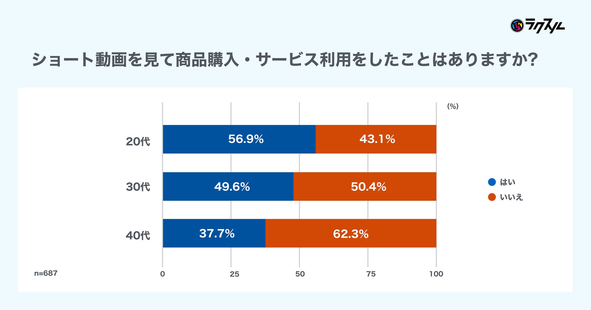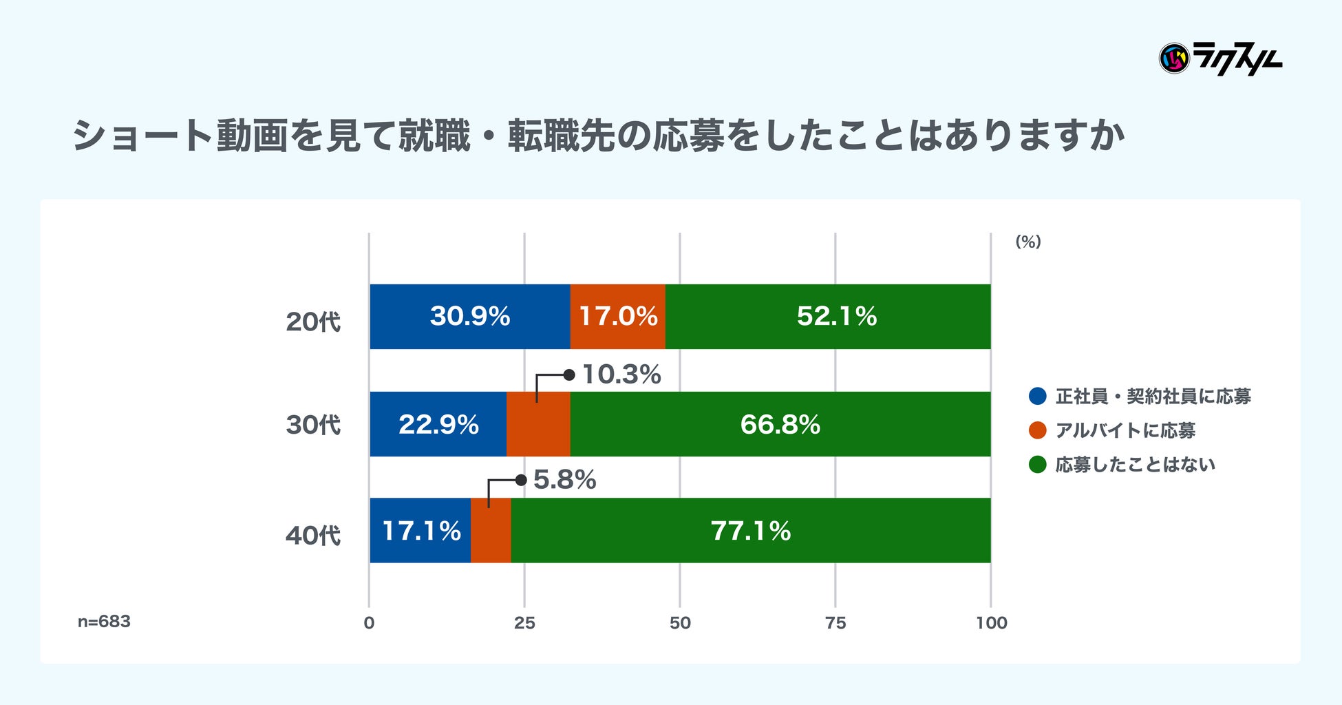 YouTube、TikTok、InstagramをはじめとしたSNSにおいて、縦型のショート動画が一般ユーザーのみならず、マーケティング活動として企業の公式アカウントからも発信されることが増えてきました。ラクスルにてショート動画に関する調査を実施した結果、「ショート動画を見て商品購入やサービス利用の経験がある」と回答した人は全体で約47%、20代においては約57%と過半数以上の回答になりました。また、商品購入やサービス利用だけでなく、就職や転職活動においても「ショート動画を見て社員やアルバイト応募をしたことがある」と回答した人が全体で約33%という結果になりました。