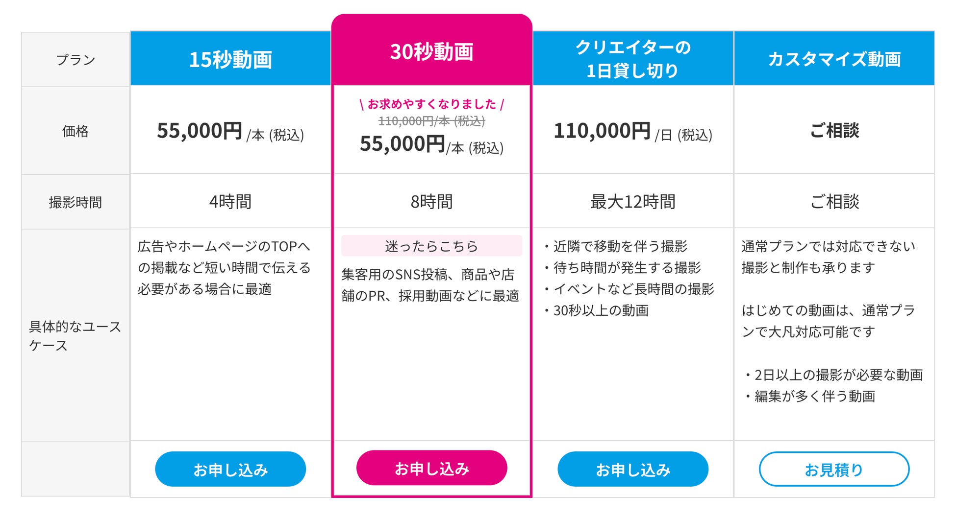 そこで、1日で複数本分の動画を撮影し、翌日納品するサービスを低価格で提供することにより、企業のマーケティング活動、採用活動に貢献できると考え、この度「15万円で たくさんユーザーボイス プラン」の提供にいたりました。