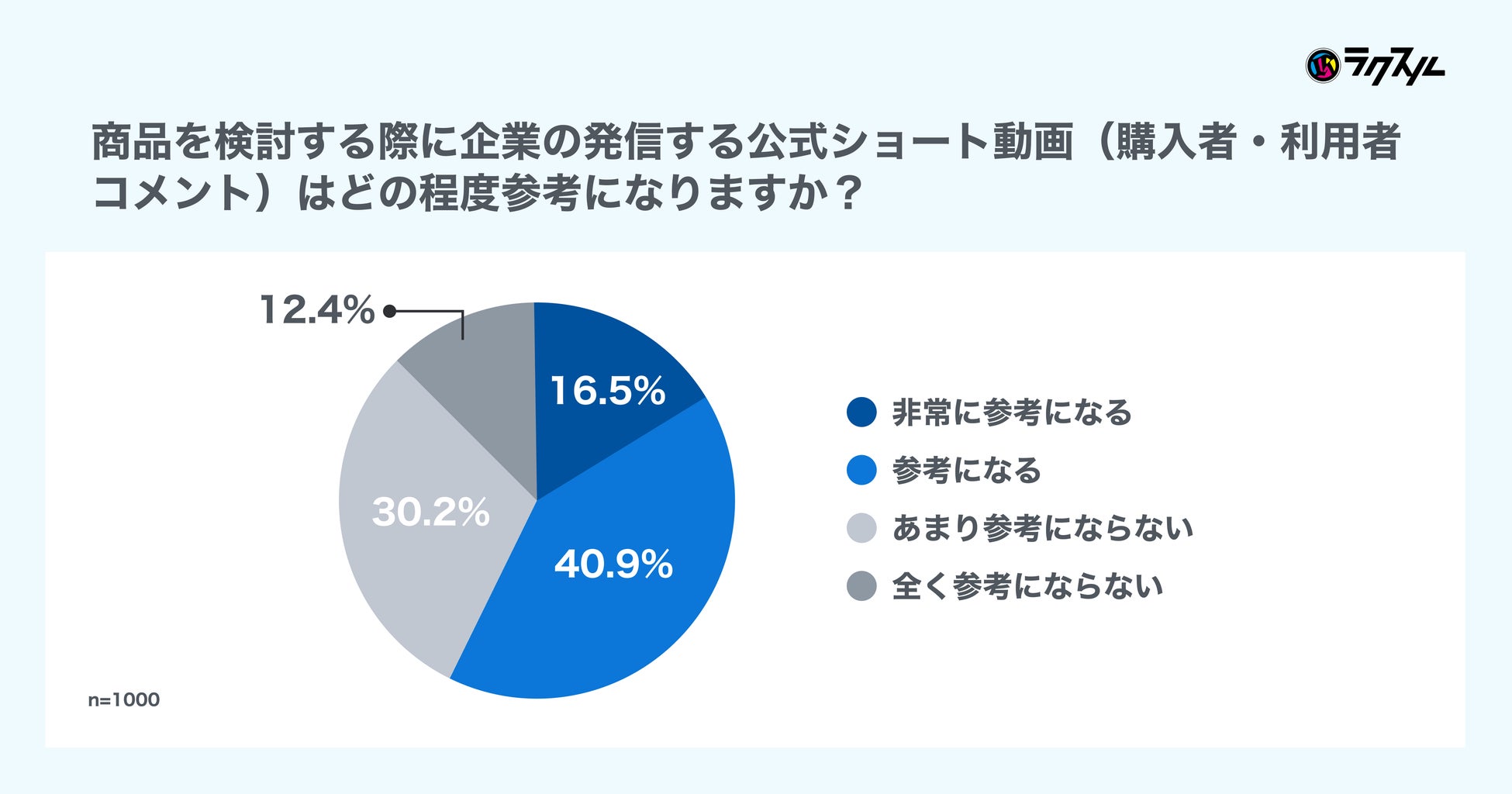 商品購入を検討する際に、企業による公式ショート動画が非常に参考になる、参考になると回答した人は約57%という結果になりました。男性は趣味に関連するもの、女性は美容商品などがショート動画をきっかけに購入されていました。