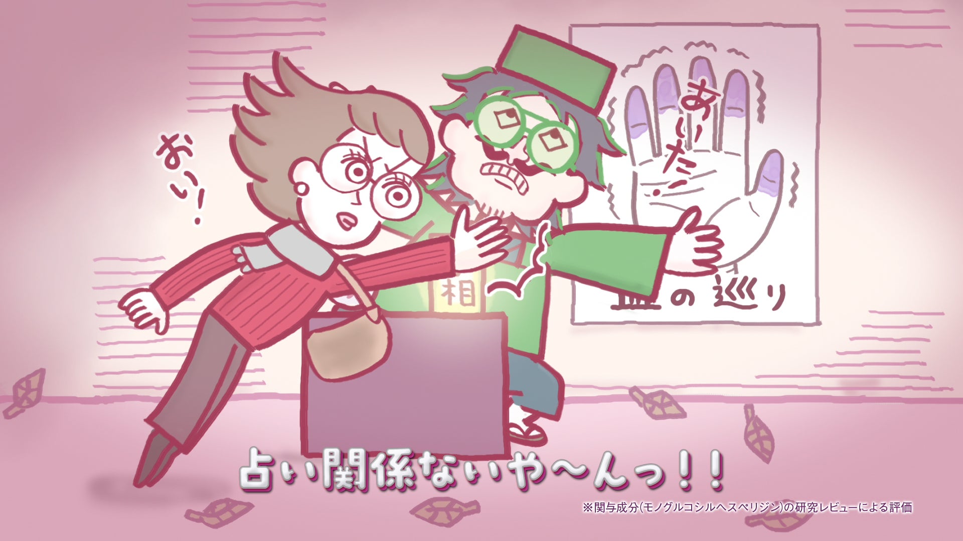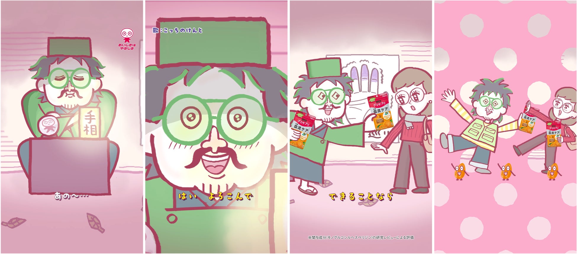 とある寒い冬の日。悩みをかかえた女性が訪れたのは、路上の手相占い。「最近、流れが悪くて…」という相談に対して、「はいよろこんで!」と手相を見始める占い師に扮したこっちのけんとさん。女性が抱えていた悩みは運気の流れかと思いきや、なんと血流のことだった!そこで、こっちのけんとさんが「UHAグミサプリ 血流ケア」を差し出し、冬に冷えがちな“手足先のため”歌い出すというストーリー。冬の寒さを表現したイラストと、最後のギリギリダンスに注目です。ダンスパートのみの15秒バージョンと縦型バージョンも併せてお楽しみください!