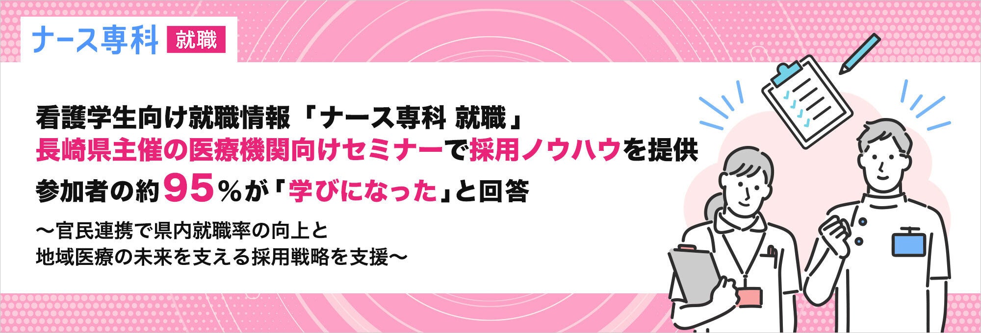 株式会社エス・エム・エス(本社:東京都港区、代表取締役社長:後藤夏樹、東証プライム、以下「当社」)が提供する、看護学生向け就職情報「ナース専科 就職」(URL:https://recruit.nurse-senka.com/)において、長崎県主催の「看護職員採用力向上セミナー」を運営したことをお知らせします。10月16日(木)、23日(木)、28日(火)の3日間にわたりオンラインで開催した本セミナーは、長崎県内の医療機関における看護職員の採用力向上を目的としたもので、参加者の約95%が「学びになった」と回答し、高い満足度を獲得しました。