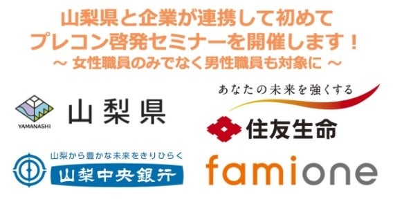 本プレコン啓発セミナーは、山梨県と包括連携協定を締結している住友生命保険相互会社が主催となり、山梨中央銀行の協力を得て銀行に入行3年目の研修として開催されます。山梨県が企業と連携して初めて開催する「プレコン啓発セミナー」となり、1県3社による取り組みとなります。