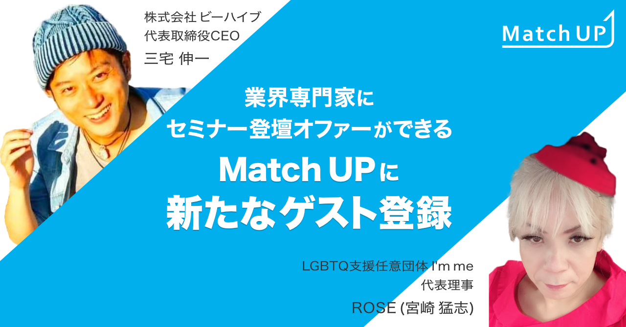 業界専門家にセミナー/イベント登壇のオファーができる「Match UP」LGBTQ 支援任意団体 I'm me ROSE(宮崎猛志)氏、株式会社ビーハイブ三宅伸一氏などが新たにゲスト登録